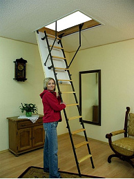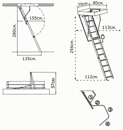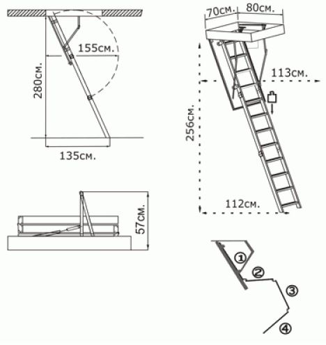 Термоизоляционная крышка типа "сэндвич", толщиной 30 мм, утеплена пенопластом, облицована с двух сторон ДВП белого цвета. По контуру короба имеется уплотнитель, высота короба 140 мм. Все металлические элементы лестницы покрашены порошковой краской, ступени лестницы имеют антискользящие насечки.