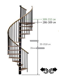 Лестница представлена в двух вариантах: с поворотом направо и с поворотом налево. Благодаря возможности регулировать высоту шага с помощью пластиковых вставок (входят в базовый комплект), высоту лестницы можно варьировать в пределах от 2860 до 3090 мм. Кроме того, купив дополнительную секцию для этой лестницы, можно поднять высоту до 3320 мм.