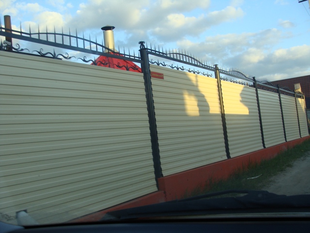Забор из профнастила с листом, расположенным горизонтально. Преимущество данного заборав его невысокой стоимости, но есть существенный недостаток, у данного ограждени я отсутствуют горизонтальные лаги, лист крепиться непосредственно к столбу ограждения.